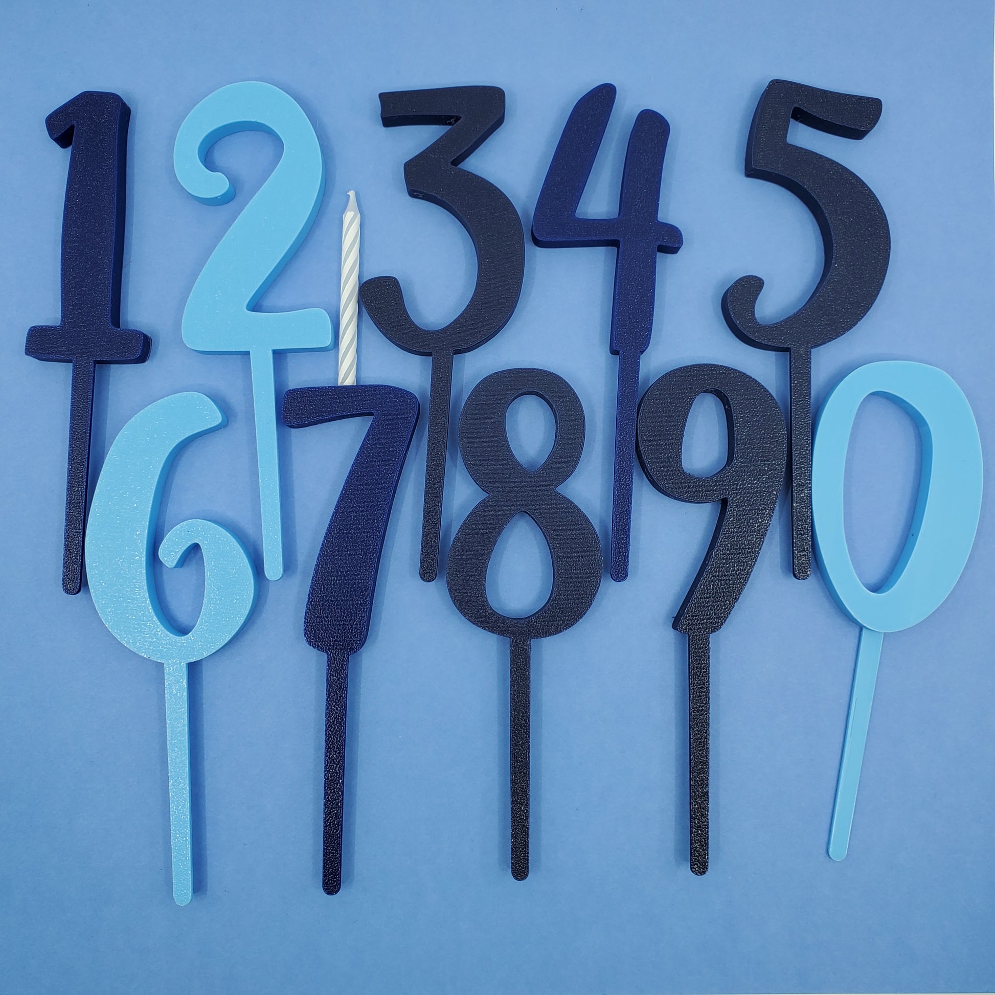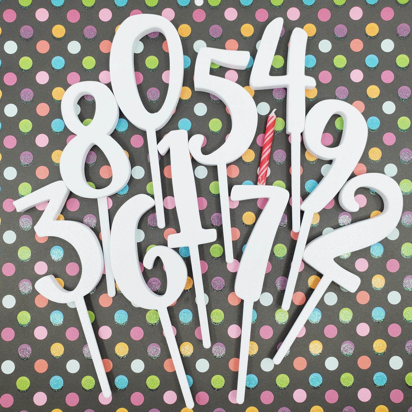 These colorful numbers will make your birthday cake feel even more special. This set of 3" tall Birthday Number Cake Toppers (0-9) will add excitement to your birthday or anniversary celebration! The extra bonus is these cake toppers are also birthday candle holders. The hole at the top of each number fits a standard (3/16" diameter) birthday candle. (Candle not included.)